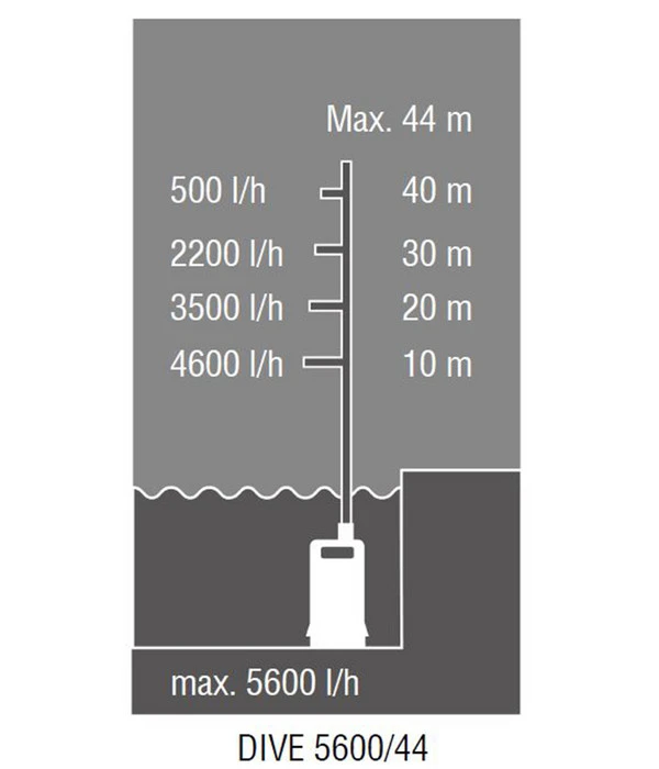 Wenn Sie auf der Suche nach einer leistungsstarken Pumpe für große Fördermengen sind, dann probieren Sie doch mal die AL-KO Tauchdruckpumpe DIVE 5600/44 aus. Sie vereint die Vorteile einer Garten- und einer Tauchpumpe miteinander, denn das Kraftpaket fördert bis zu 5600 l/h bei einer maximalen Förderhöhe von 44 m. Damit ist sie ideal zum Abpumpen von Brauchwasser beispielsweise aus der Zisterne geeignet. Machen Sie keine Kompromisse mehr, sondern sichern Sie sich jetzt diese kräftige Tauchpumpe für Ihre Ausstattung!