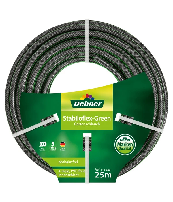 Genug geärgert mit Gartenschläuchen, die nicht so wollen wie Sie! Der Dehner Gartenschlauch Stabiloflex macht Schluss mit ständigem Verdrehen und Verwinden. Einfach abrollen, aufdrehen, und Wasser marsch! Damit wird das Gießen zum Vergnügen – nicht nur für Sie, sondern für die gesamte Familie. Und dabei ist es ganz egal, wie groß Ihr Garten ist, denn den Dehner Gartenschlauch Stabiloflex gibt es in unterschiedlichen Längen und Durchmessern.