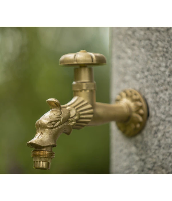 Fügt sich harmonisch in jede Gartenanlage ein – mit Drachenkopf-Wasserhahn als toller Blickfang