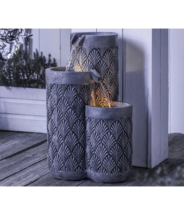 Es gibt viele Möglichkeiten, das Element Wasser in eine Gartenanlage zu integrieren. Mit dem Dehner Polyresin-Gartenbrunnen Palermo entscheiden Sie sich für eine der interessantesten und dekorativsten Arten. Denn die hohen, zylindrischen Wasserbehälter des Brunnens sind mit einem traditionellen Palmen-Motiv verziert, wie man es aus Nordafrika und den benachbarten Regionen kennt; Einflüsse, die auch in der Kultur Siziliens bis heute spürbar sind. Ein Deko-Objekt, das das Flair Ihrer Gartenanlage entscheidend mitprägen wird und zugleich aus Ihrem Gartensitzplatz eine Wellness-Oase macht. Denn neben seinem stilvollen Look wird auch das leise Säuseln des Wassers, wenn es von einer Ebene auf die andere rinnt, zur entspannten Atmosphäre beitragen. Entspannt können Sie auch dem Aufbau des Brunnens entgegensehen, denn er kommt als Komplettset zu Ihnen, bei dem alles dabei ist, was Sie für die Montage brauchen: die Pumpe, der Trafo und die zwei LEDs. Bestellen Sie deshalb gleich den Dehner Polyresin-Gartenbrunnen Palermo für Ihre grüne Oase!