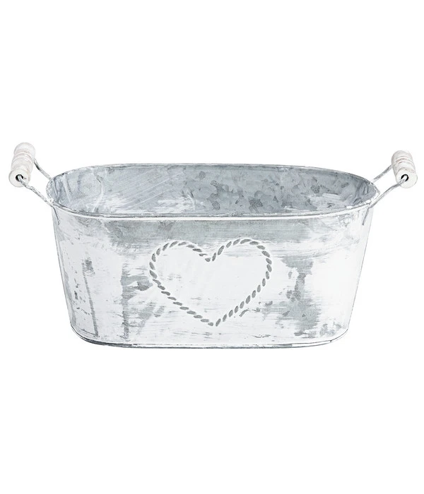 Mit der prächtigen Dehner Zink-Jardiniere mit Henkel haben Sie ein Deko-Accessoire zur Verfügung, welches Sie sowohl im Haus als auch im Garten benutzen können. Die überaus dekorativ gestaltete Zinkwanne erfreut das Herz des Betrachters nicht nur durch ihren trendigen Shabby-Look, sondern begeistert auch durch die romantische Herzprägung an der Längsseite. Dadurch besitzt die Jardiniere Zink in bekannter Dehner Markenqualität einen unverwechselbaren Charme.