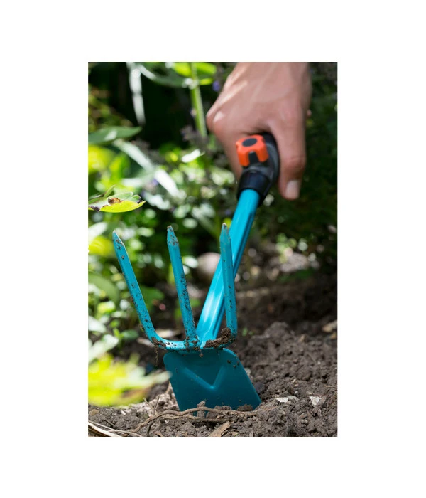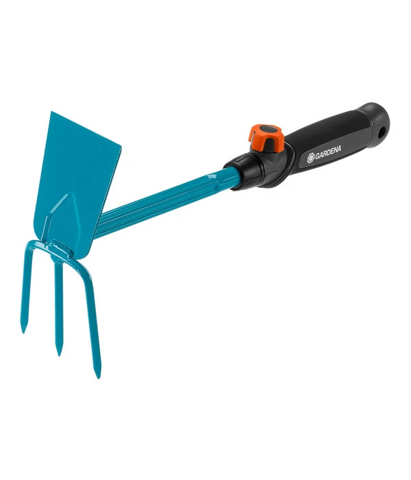 Dieses multifunktionale Werkzeug wird schnell zum unverzichtbaren Begleiter bei der Gartenarbeit. Dafür sorgt die beidseitige Bestückung des GARDENA combisystem-Kleinhäckchens mit drei Zinken, einem rechteckigen Blatt und einer Arbeitsbreite von 6,5 cm. Die kleine Hacke aus hochwertigem Qualitätsstahl ist dank ihrer Duroplast-Beschichtung korrosionsgeschützt. Dadurch ist das Gartengerät zudem besonders robust und unempfindlich gegen starke Verschmutzung. Die ergonomische Griffform verhindert mithilfe von Weichkomponenten und dem abgerundeten Ende ein Abrutschen und liegt bequem in der Hand. Das flexible Kleingerät können Sie außerdem mit jedem combisystem-Stiel verlängern. Lösen Sie dafür die unverlierbare Feststellschraube aus Weichkunststoff und setzen Sie einen alternativen Stiel ein. Auf das praktische Qualitätswerkzeug erhalten Sie 25 Jahre Garantie vom Hersteller.