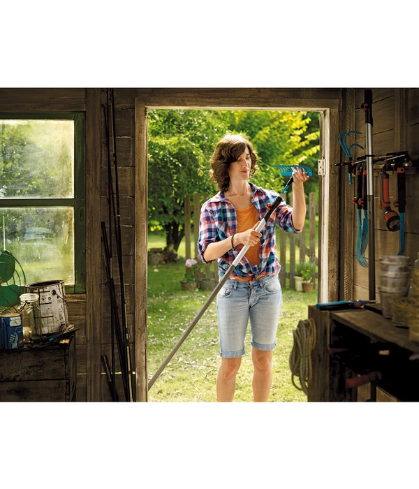 Der nächste Frühling kommt bestimmt und Sie sind darauf vorbereitet! Lassen Sie anstrengende Gartenarbeit hinter sich und erleben Sie die Einzigartigkeit des GARDENA combisystem Rechen. Durch seine Breite von 41 cm und den 16 Zinken wird das Einebnen Ihrer Gartenfläche zum Kinderspiel. In relativ kurzer Zeit kommen Sie Ihrem Traum von einem perfekten Garten näher und Spaß macht es mit diesem Gerät allemal. Dass er dabei noch einfach in der Handhabung, praktisch und platzsparend ist wird Sie endgültig überzeugen. Rückenschmerzen gehören dank der Kombinationsmöglichkeit mit anderen zum Teil sogar verstellbarer Stiele der Vergangenheit an. Neben seinen hervorragenden Eigenschaften als Gartenhelfer besticht der blau/schwarze Rechen aus der combisystem Serie von GARDENA auch mit seiner schlichten und zeitlosen Eleganz. Ein Zubehör, das in keinem Garten fehlen sollte.