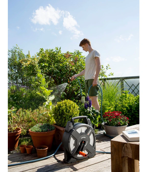 Die Terrassen-Schlauchbox City Gardening eignet sich durch die Länge des Wasserschlauchs perfekt für kleinere Gärten oder auch für Ihre Dachterrasse. Außerdem ist sie aufgrund ihres kompakten Designs und die einklappbare Handkurbel besonders platzsparend in der Aufbewahrung. Der ebenfalls klappbare Tragegriff macht Ihnen den Transport sehr einfach und liegt gut in der Hand.