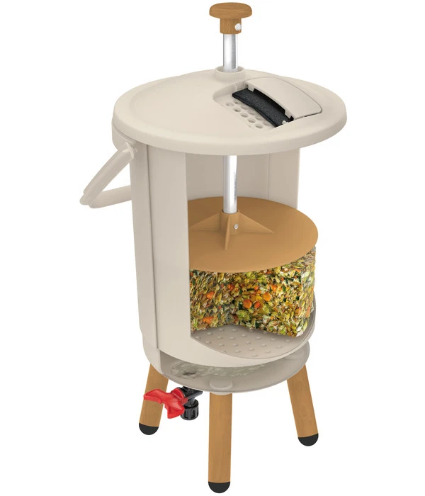 Der formschöne JUWEL® Komposter arbeitet anders als traditionelle Alternativen unter Ausschluss von Luftsauerstoff. Für optimale Fermentationsbedingungen werden organische Küchenabfälle nach Zugabe des Bokashi Granulats als Fermentationshilfe (nicht im Lieferumfang enthalten) von außen mit einem Kolben auf ein minimales Volumen zusammengepresst, ohne dass Sie sich die Hände schmutzig machen müssen. Dank dieser Verdichtung finden große Abfallmengen im handlichen Innenbehälter Platz und die austretende Flüssigkeit können Sie verdünnt ins Gießwasser geben. Zudem arbeitet der Komposter sehr schnell und effektiv. So können Sie bereits nach 3 bis 4 Wochen den fertigen Bio-Dünger entnehmen und für Ihre Pflanzen verwenden!