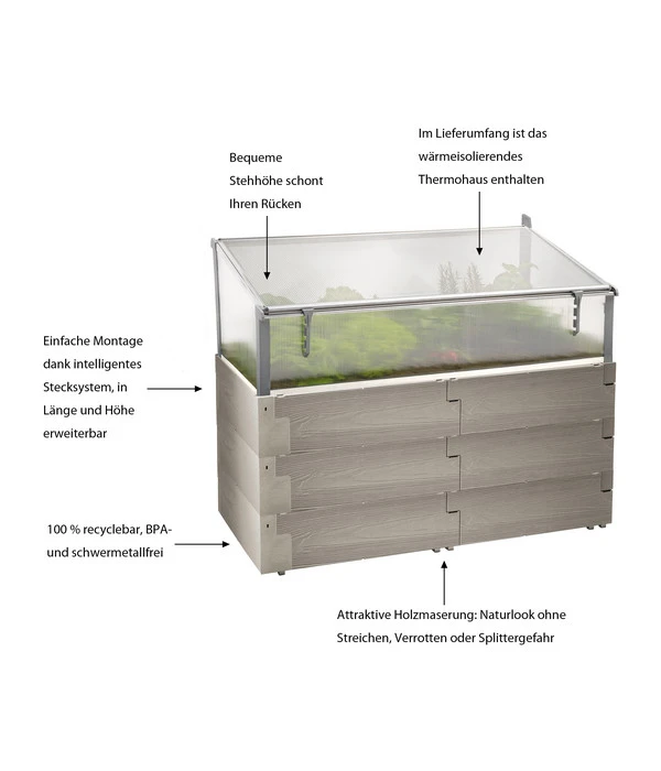 Haben Sie sich schon überlegt, was Sie diesen Frühling und Sommer gern einpflanzen möchten? Ab sofort dürfen auch Blumen, Gemüsesorten oder andere Pflanzen ins Beet, die über mehrere Jahre gedeihen oder bis weit in den Herbst hinein Wärme benötigen. Im Juwel Hochbeet Timber eingesetzt, werden die Pflanzen nämlich gut geschützt: Das im Lieferumfang enthaltene praktischen Thermohaus lässt sich nach Belieben aufsetzen oder abnehmen. Zusammen mit den wärmeisolierenden Bauelementen entstehen damit beste Voraussetzungen für eine bedeutend verlängerte Gartensaison. So können Sie Ihrem liebsten Hobby bis in den Herbst hinein nachgehen und mit Freude Ihre im Hochbeet eingesetzten Pflanzen pflegen. Bestellen Sie daher noch heute das traumhaft schöne und praktische Juwel Hochbeet Timber Kombiset – für viele glückliche Stunden in Ihrem Garten!