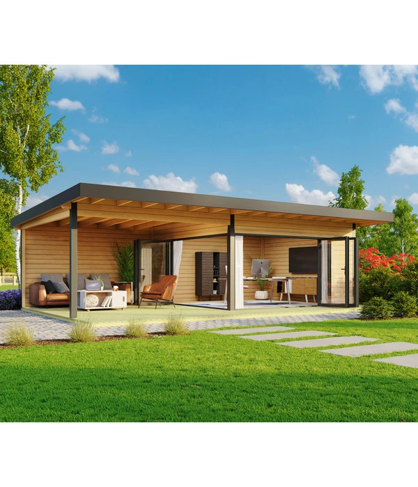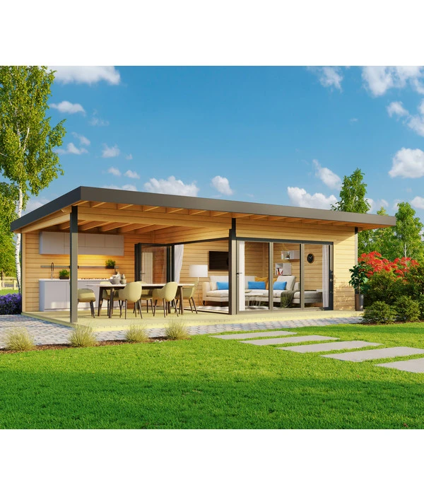 Wenn Ihr Gartengrundstück im Grünen bisher schon Ihr großes Glück war, dann könnte es schon bald Ihre grüne Oase mit Traumhaus sein. Denn wer sich und seine Lieben mit einem Lasita Maja Blockbohlenhaus Domeo 10 beschenkt, der bekommt genau das. Kaum zu glauben, wie attraktiv, ideenreich und gemütlich ein Holzgartenhaus sein kann. In diesem Fall verwandeln Sie ca. 36 m² in ein kubisches Design-Holzhaus, das mit einem großzügigen Innenraum und einer komplett überdachten Veranda begeistert. Dabei präsentiert sich der Raum mit einer großzügigen Fensterfront über zwei Seiten, die nicht nur für eine beeindruckende Optik sorgt, sondern auch einen lichtdurchfluteten Innenraum schafft. Bei geöffneten Türen verschmelzen Innenraum und Garten zu einer Einheit. Eine Situation, die es Ihnen ermöglicht, beim Entspannen auf jegliche Witterung zu reagieren: Hinaus in den Garten, um die Sonne zu genießen, auf die Veranda um Sonne oder Regen zu entkommen oder hinein ins Gemütliche, um vom kuscheligen Sofa ins kühle Gartenambiente zu blicken. Die dunklen Akzente, die Dachblende, Fensterrahmen und Säulen setzen, bringen Struktur und Leben in die beeindruckende Holzkonstruktion. Folgen Sie Ihrer Eingebung und verzaubern Sie Ihren Garten mit einem Lasita Maja Blockbohlenhaus Domeo 10!