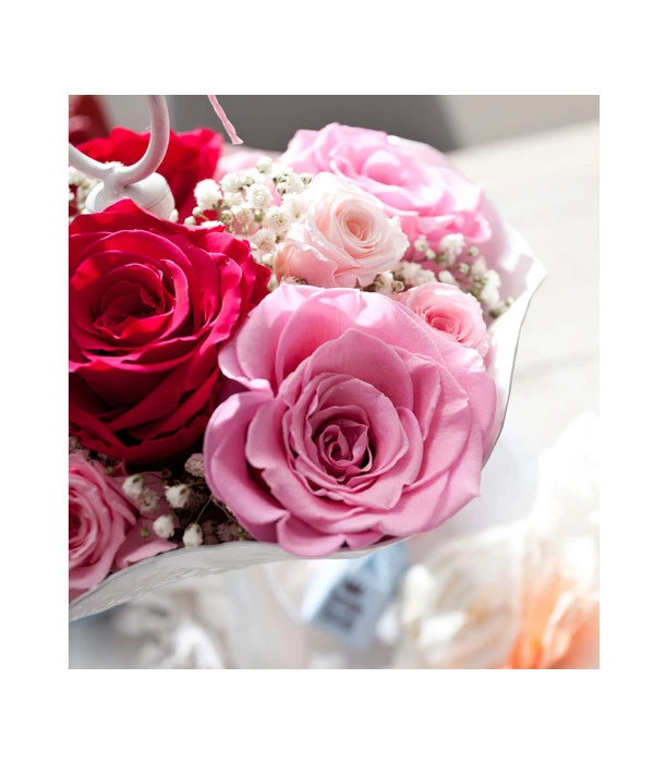 Sie basteln gerne und haben einen Sinn für Dekoratives und Schönes? Dann werden Ihnen Sträuße und Arrangements mit Long-Life-Rosen lange Freude bereiten. Das Naturprodukt lässt sich vielfältig für jede Menge schöne Ideen verwenden. Sie können die einzelnen Blüten einfach mit Draht oder auch mit Heißkleber auf verschiedenen Oberflächen befestigen. Ein liebevoll arrangierter Kranz, ein Gesteck in einer Keramikschale für den Tisch oder ein Glasgefäß für die Kommode – mit den Long-Life-Rosen gelingt der große Auftritt spielend!