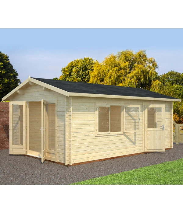 Die gesamte Konstruktion zeichnet sich durch Stabilität und Robustheit aus. Unter anderem verfügen die Fenster und die Türen über Doppelverglasung, Dichtungen sowie aufgesetzte Sprossen. Die grundierten Blockbohlen mit Chaletschnitt-Eckverbindung sind ein Garant dafür, dass der Wind effektiv abgehalten wird. Ebenfalls gehören zum Bausatz imprägnierte Fundamenthölzer, massive Dach- und Fußbodenbretter mit Nut sowie Feder, zuverlässige Sturmleisten und ein praktisches Montageset. Wenn Sie das Gartenhaus Irene der Marke Palmako noch charmanter aussehen lassen wollen, bestellen Sie am besten die passende Dacheindeckung direkt mit dazu und nehmen den gesamten Bausatz an Ihrem Wohnort bequem entgegen!