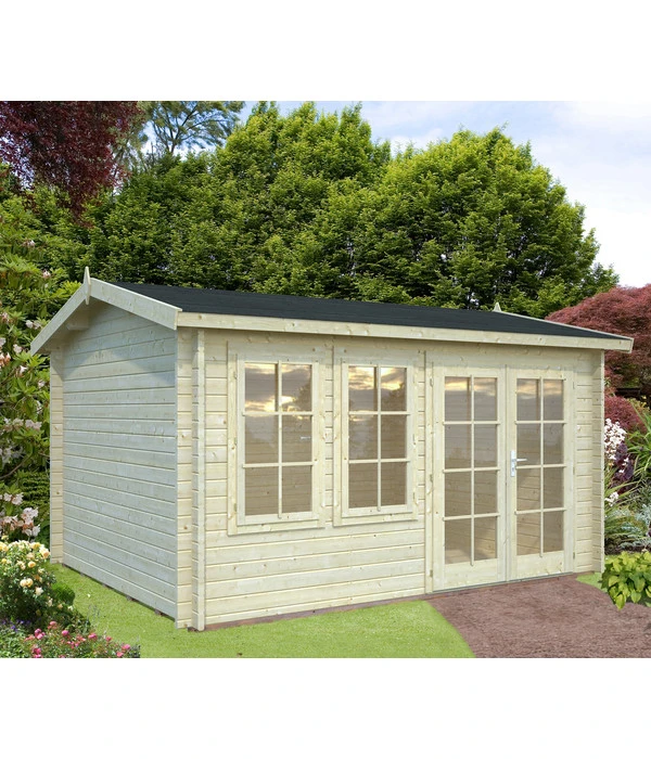Damit das in Blockbohlenbauweise gestaltete Palmako Gartenhaus Iris auch bei kühleren Temperaturen Komfort und Wohlgefühl bieten kann, verfügt es über winddichte Chaletschnitt-Eckverbindungen. Des Weiteren warten sowohl die Einzelfenster als auch die Doppeltür mit Gummidichtungen und Doppelverglasungen auf. Das Haus mit klassischem Satteldach ist bereits tauchgrundiert und kann entsprechend Ihren Vorstellungen farblich angepasst werden. Machen Sie Ihren Garten noch attraktiver und gönnen Sie sich das Häuschen Iris von Palmako! Bestellen Sie am besten gleich eine zu diesem Modell passende Dacheindeckung dazu!