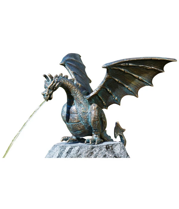 Als Drachenliebhaber wollen Sie in Ihrem Außenbereich auf eine extra originelle Ausführung setzen? Wie wäre es dann mit dem nicht feuer-, sondern wasserspeienden Rottenecker Bronze-Drache Terrador? Die imposante Figur wirkt sehr beeindruckend an Ihrem Teich oder einem kleinen Bachlauf, der dank seiner Präsenz so richtig zur Geltung kommt. Mit weit ausgebreiteten Flügeln und einem energischen Blick scheint der Drache gleich in die Lüfte steigen zu wollen, jedoch hat er nun seinen festen Platz in Ihrem Garten gefunden. Genügsam begeistert er hier mit seinem faszinierenden Wasserspiel, wodurch er viel Aufmerksamkeit bekommt.