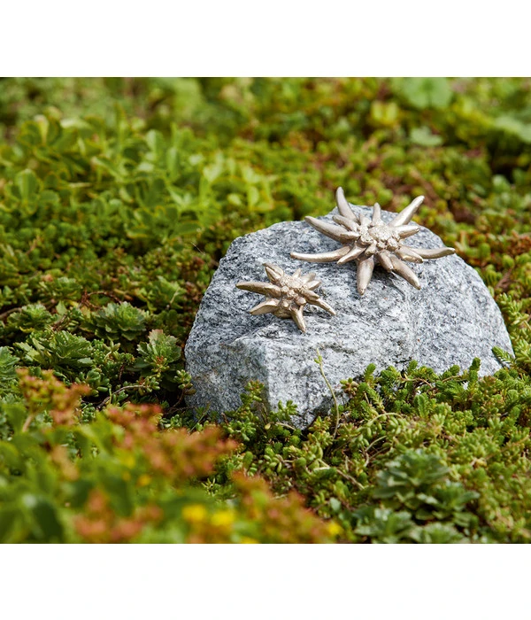 Edelweiß, das Symbol der Alpen, ist nach manchen Legenden ein vom Himmel gefallener Stern. Und jetzt ist dieser funkelnde Stern in Ihrem Garten gelandet und glänzt als Rottenecker Bronzefigur Edelweiß auf Schwarzwaldgranit. Klein, aber edel ist die Ausstrahlung der Rottenecker Bronzefigur Edelweiß auf Schwarzwaldgranit. Ein Bronzekunstwerk von allerhöchster Qualität, das Sie ganz in der Nähe Ihres Gartensitzplatzes dekorieren sollten, damit Sie sich immer am funkelnden Anblick der Rottenecker Bronzefigur Edelweiß auf Schwarzwaldgranit erfreuen können. Da die Rottenecker Bronzefigur Edelweiß in aufwändiger Handarbeit gefertigt wird, ist jede Bronzefigur von Rottenecker ein echtes Unikat, ebenso wie der Schwarzwaldgranit, bei dem auch jeder Stein ein Einzelstück mit individuellen Farbnuancen und Maßabweichungen ist.