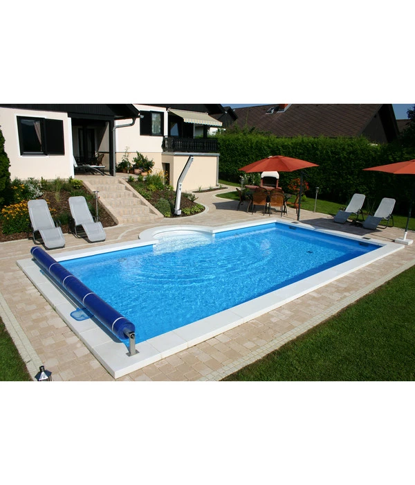 Es ist Sommer, es ist richtig heiß und Sie sind gerade in Ihre Badesachen geschlüpft. Mit einem Handtuch über der Schulter gehen Sie die Treppe von der Terrasse hinunter, wo Ihnen Ihr Ziel schon in kühlem Blau entgegenstrahlt: Ihr Summer Fun Styroporbecken-Set mit Römertreppe. Sie legen die Accessoires auf der Sonnenliege ab und steigen die zauberhaften, halbrunden Poolstufen hinab und versinken dabei tiefer und tiefer im kühlen Poolwasser. Was für eine Wohltat! Sie breiten die Arme aus und machen gleich ein paar erfrischende Züge im Wasser. Mit diesem Traum-Pool hat sich einer Ihrer größten Wünsche auf denkbar einfache Weise erfüllt. Und er fügt sich nicht nur optimal in Ihre Gartenlandschaft ein, sondern verleiht ihr das Flair einer eleganten Wellness-Oase. Entscheiden Sie sich für ein Summer Fun Styroporbecken-Set mit Römertreppe und Sie werden Ihren Garten mehr lieben als jemals zuvor!