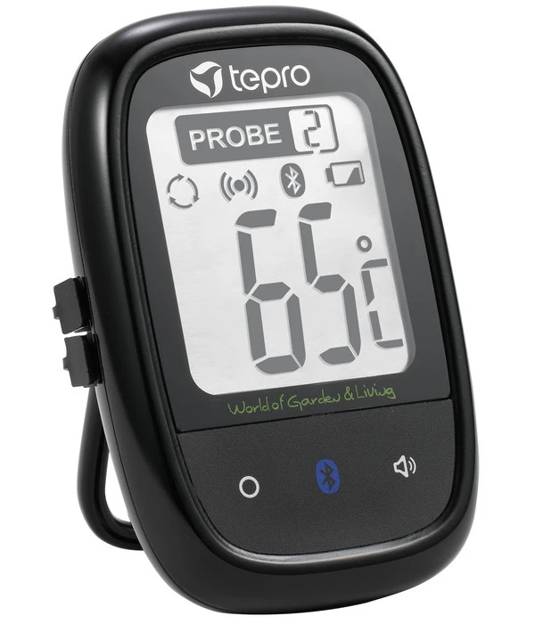 Das tepro Bluetooth Grillthermometer erlaubt es Ihnen, die Temperatur Ihres Fleisches während des Grillens exakt zu überwachen. Wählen Sie Ihre individuelle Zieltemperatur und sitzen Sie dank Bluetooth-Funktion ganz entspannt bei Ihren Gästen, während Ihr Grillgut am Rost langsam seinen köstlichen Duft verbreitet. Mit der inkludierten Grill-App erhalten Sie alle Daten in Echtzeit und erfahren per Signal, wann Ihr Fleisch fertig ist!