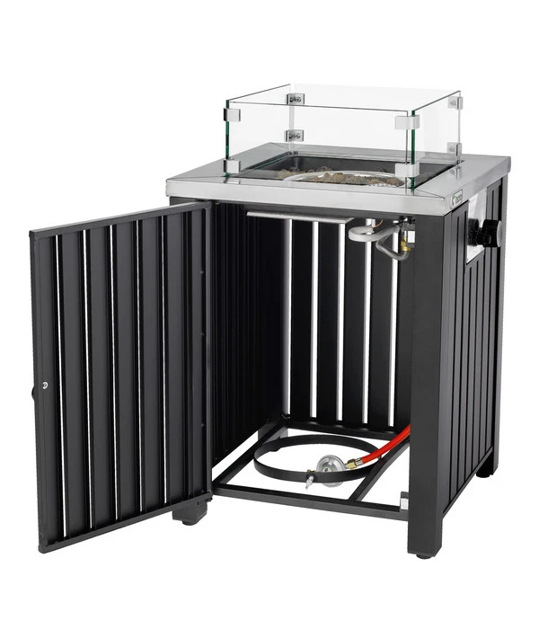 Ihre neue tepro Gasfeuerstelle Topeka wird Ihnen aber nicht nur aus ästhetischer Sicht Freude bereiten. Sie werden die Vorzüge dieses bestens durchdachten Objekts auch an der einfachen Bedienung erkennen. Denn die tepro Gasfeuerstelle Topeka besitzt eine elektrische Piezo-Zündung für eine kinderleichte Handhabung. Und natürlich lassen Sie die Gasflasche im Gehäuse verschwinden. Öffnen Sie dafür einfach die kleine Seitentür, stellen die Flasche in die speziell dafür vorgesehene Halterung und schon kann sie angeschlossen werden und wieder komplett aus Ihrem Sichtfeld verschwinden.