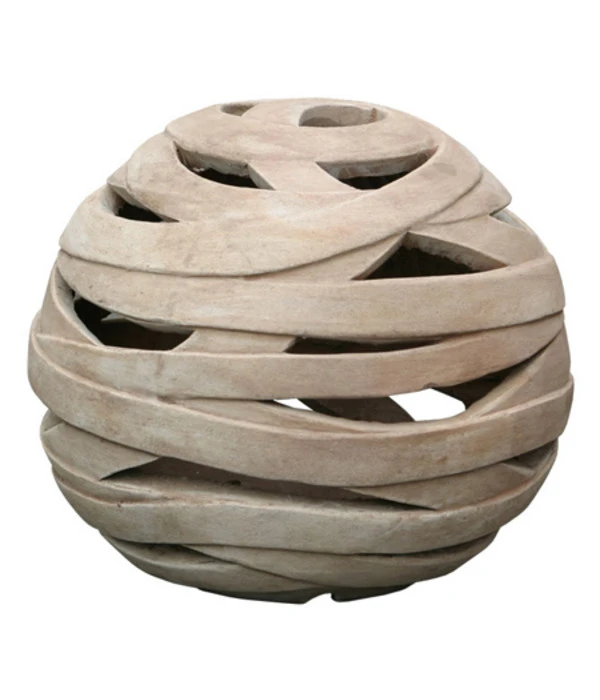Modernes Design in Kombination mit klassisch mediterranem Flair – so könnte man die außergewöhnliche Wirkung dieser Terrakotta-Kugel beschreiben. Raffiniert gewickelte Tonstränge fügen sich bei diesem extravaganten Deko-Objekt zur Kugelform zusammen, die sich aber der Perfektion einer vollendeten Rundung widersetzt. Interessant kontrastiert wird diese moderne Eigenwilligkeit durch das traditionsreiche Material Ton, aus dem die Terrakotta-Kugel gefertigt wurde. Das Mischen von Ton, Lehm und Wasser gehört zu den ältesten Kulturtechniken der Menschheit und blickt auf eine fast 10.000jährige Geschichte zurück. Erstaunlich ist, wie früh der Mensch bei den verschiedensten Arten von Gefäßen schon auf die optische Wirkung achtete, ob es sich um Objekte zu kultischen Zwecken, zur Lagerung von Lebensmitteln oder um Pflanzgefäße handelte. Durch das klassische Material reiht sich die Terrakotta-Kugel in die Gruppe berühmter Vorbilder ein, die seit Jahrtausenden rund ums Mittelmeer im Gebrauch waren. Die außergewöhnliche Wickeloptik und das interessante Spiel mit Durchblicken ins geheimnisvolle Innere aber machen die Terrakotta-Kugel zu einem modernen Deko-Objekt von ganz besonderer Faszination.