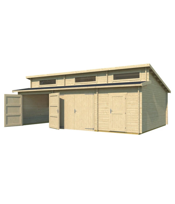 Die Weka Doppelgarage 441 aus massivem Fichtenholz bietet Ihnen alles, was Sie sich als Unterstellplatz zum Schutz Ihrer Fahrzeuge wünschen. Die hochwertige Garage ist, dank ihrer dicken Blockbohlen, sehr stabil und widerstandsfähig. Sie bietet Ihnen genügend Platz, um zwei Autos optimal vor Wettereinflüssen, wie Regen, Nässe, Sonneneinstrahlung oder Hagel, zu schützen. Die hervorragende Verarbeitung garantiert Ihnen außerdem eine lange Haltbarkeit der Unterstellmöglichkeit, sodass Sie über viele Jahre von ihren Vorzügen profitieren. Besonders praktisch ist auch der separate Abstellraum, in dem Sie Ihre Fahrräder, Gartengeräte oder anderen Utensilien problemlos lagern können.