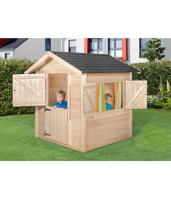 Drachenhöhle Tabaluga, natur, 21 mm, moderne Eckverbindung, 120 x 125 cm in stabiler Blockbohlenbauweise. Das Dach hat eine Massivholz-Stärke von 16 mm und steht rundum 10 cm über.