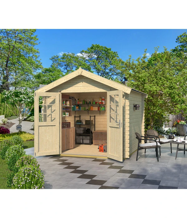 Die leichtgängigen Doppeltüren des Weka Gartenhauses 209 lassen dank der eingebauten Fenster viel Licht ins Innere. So haben Sie stets einen guten Überblick über Ihre Gerätschaften. Gleichzeitig lässt die Doppeltür das Ein- und Ausräumen großer Maschinen zum Kinderspiel werden. Die Griffgarnitur inklusive Profizylinderschloss und drei Schlüsseln ist im Lieferumfang bereits enthalten. Das abschließbare Weka Gartenhaus eignet sich daher auch ideal für Kleingartenparzellen und abgelegene Grundstücke. Greifen Sie jetzt zu!