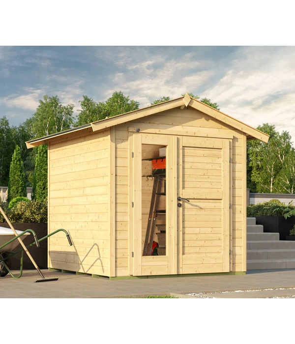 Das künftige Zuhause für Ihren Rasenmäher, die Heckenschere und Co. verfügt über eine schicke Doppeltür, die ein großzügiges Fenster hat. Deswegen fällt bei schönem Wetter ausreichend Tageslicht ins Innere, sodass Sie das benötigte Werkzeug rasch hervorgenommen haben. Dank des Profilzylinderschlosses ist sichergestellt, dass sich niemand unerlaubt Zugang zu Ihren Gartengeräten verschafft. Im Lieferumfang sind praktischerweise ein robustes Satteldach und ein massiver Holzboden enthalten. Beide Komponenten garantieren Ihnen, dass der Schuppen äußerst stabil ist und daher Ihre Gartenutensilien jederzeit bestens beschützt. Wenn Sie Sägen, Schaufeln etc. vor Witterungseinflüssen bewahren möchten, bestellen Sie das aus hochwertigem, europäischem Fichtenholz hergestellte Gartenhaus 224 A Gr. 1 von Weka!