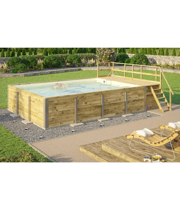 Nicht nur optisch ist Ihr aus kesseldruckimprägniertem Kiefernholz gefertigter Pool eine überzeugende Sache. Er bringt viele funktionelle Features mit und lässt auch in Sicherheitsfragen keine Wünsche offen. Spezielle Metallstützen und Eckverbindungen sorgen für zuverlässige Stabilität und eine hochwertige Sandfilteranlage ist im Lieferumfang bereits enthalten. Greifen Sie zu, gönnen Sie sich ein bisschen Luxus und holen Sie sich den tollen Weka Massivholzpool 595!