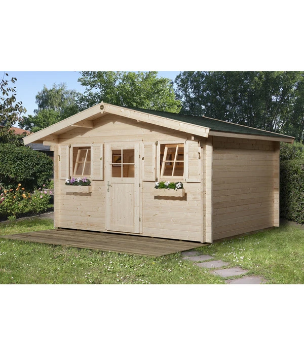 Gartenhaus in stabiler Blockbohlenbauweise, 45 mm Wandstärke, mit 19 mm Massivholzdach und Massivholzboden