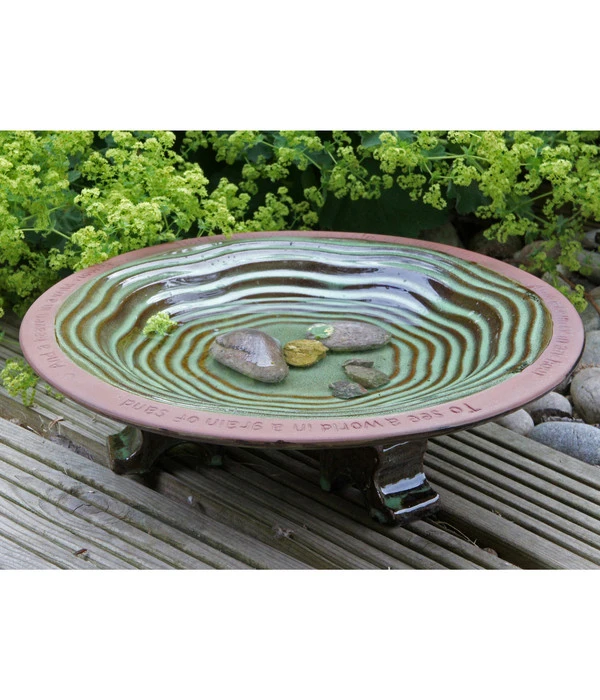 Schließen Sie doch einmal kurz die Augen und stellen sich Folgendes vor: Es ist ein lauer Sommerabend, Sie sitzen in Ihrem grünen Paradies und lauschen fröhlichem Vogelgezwitscher – wunderschön, nicht wahr? Das muss kein Traum bleiben. Die Wildlife Vogeltränke Echoes wird ganz schnell zum attraktiven Treffpunkt von Rotkehlchen, Spatz & Co in Ihrem Garten, auf der Terrasse oder Ihrem Balkon werden. Farblich passt sich die Wildlife Vogeltränke Echoes perfekt der Natur an – die glasierte Schale ist am Rand terrakottafarben und geht dann wellenförmig in einen natürlichen Grünton über. Das „Wellenstufen-Design“ hat außer seiner attraktiven Optik noch einen Vorteil: Es ist rutschsicher und bietet so den kleinen Sängern guten Halt beim Trinken und beim Landeanflug! Den Rand der Wildlife Vogeltränke Echoes ziert obendrein ein Zitat von William Blake, einem englischen Dichter aus dem 18. Jahrhundert: „Hold infinity in the palm of your hand – and eternity in an hour – to see a world in a grain of sand – and a heaven in a wildflower“ – wunderschön! So wird Ihr Vogeltreffpunkt, die Wildlife Vogeltränke Echoes, noch stimmiger mit der Natur!