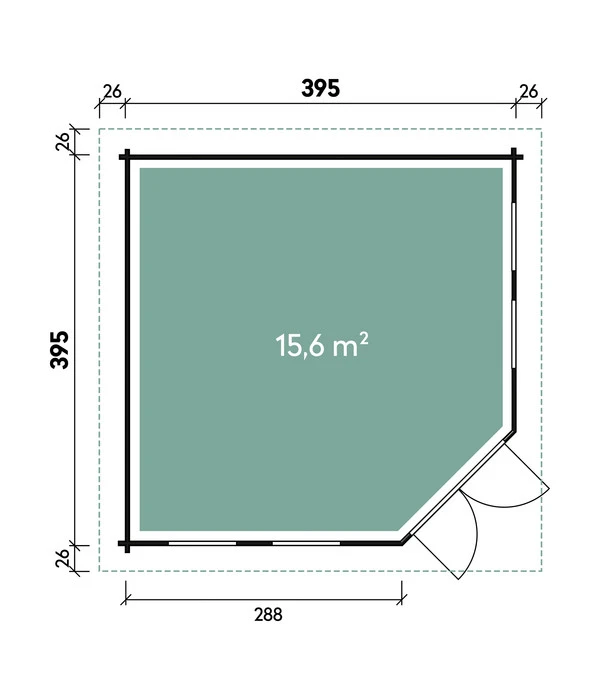 15,6 m², Wandstärke 44 mm, Leimholztür, Echtglasfenster