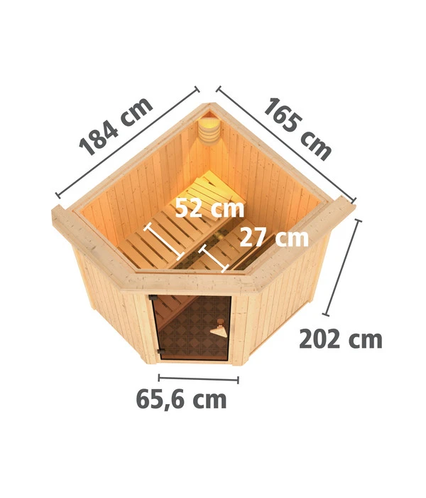 Diese Sauna hat tatsächlich nur den minimalen Platzbedarf von 2,3 m² und bietet Ihnen trotzdem alles für den perfekten Saunagenuss. Denn ein Prinzip des Unternehmens Wolff Finnhaus lautet, dass nicht nur große Saunahäuser in bester Material- und Verarbeitungsqualität gefertigt werden, sondern auch so kleine Modelle wie die Wolff Finnhaus Innensauna de luxe Dorea. Deshalb erwartet Sie im Inneren der Sauna perfektes Saunaklima einschließlich des angenehmen Holzdufts, der zum entspannten Schwitzen einfach dazugehört. Lehnen Sie sich deshalb bald zurück auf einer der Saunabänke und genieß0en Sie die Hitze, mit dem guten Gefühl, Ihrem Kopf und Körper etwas Gutes zu tun. Denn der Hitze-/Kälte-Wechsel einer finnischen Sauna kurbelt Herz und Kreislauf an, entspannt die Muskeln und stärkt das Immunsystem. Noch ein Vorteil, den Sie schätzen werden: Dank vieler vorgefertigter Elemente lässt sich die Wolff Finnhaus Innensauna de luxe Dorea auch einfach und schnell aufbauen.