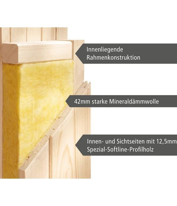 Die vorgefertigten Wände der Wolff Finnhaus Innensauna de luxe Dorea bestehen aus einer stabilen Rahmenkonstruktion, bei der sich zwischen zwei spezial Softline-Profilhölzern mit 12,5 mm Stärke eine Schicht aus 42 mm Mineraldämmwolle befindet, damit die Hitze in der Saunakabine bleibt. Auch die vormontierte Decke ist mit Mineralwolle gedämmt. Für die beiden Saunabänke wurde massives Espenholz gewählt, eine Pappelart, die sich durch eine besonders feine, glatte Oberfläche auszeichnet und gut zu reinigen ist. Außerdem wird Pappelholz nicht unangenehm heiß. Für die entspannte Wohl-Atmosphäre in der Wolff Finnhaus Innensauna de luxe Dorea sorgt auch das LED-Strahlerset mit 3 frei positionierbaren 7,5 Watt-Strahlern im Dachkranz.