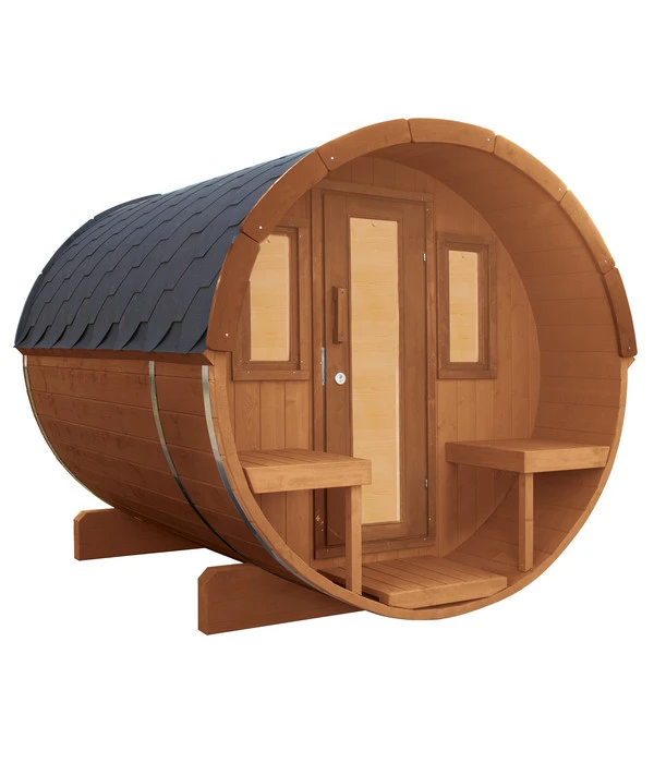 Alle Wandelemente bestehen aus 42 mm starken Bohlen, von oben schützen hochwertige, 6-eckige Dachschindeln das Fass gegen Witterung. Die Tür, durch die Sie die Saunakabine betreten, besteht aus hochwertigem Leimholz, das beste Funktionalität für viele Jahre garantiert. Die Form der relativ kleinen Tür ist für finnische Saunafässer typisch und sorgt für ein ganz eigenes Flair im Wolff Finnhaus Saunafass Basic 250 montiert. Durch das Glaselement in der Tür und die beiden Fenster kann Tageslicht ins Innere fallen, was die Wohlfühl-Atmosphäre perfekt macht.